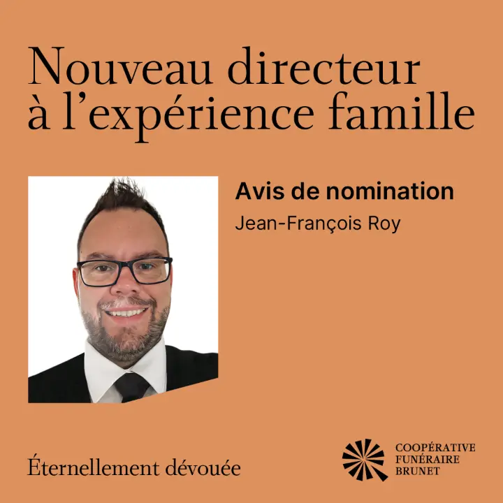 La Coopérative funéraire Brunet est convaincue que M. Jean-François Roy contribuera grandement au succès de notre équipe. On lui souhaite beaucoup de succès dans son nouveau poste.