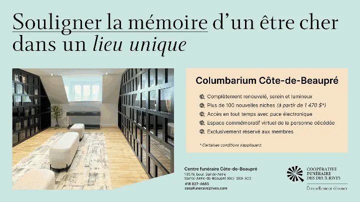Le Centre funéraire Côte-de-Beaupré est dédié à honorer la mémoire de vos proches qui nous ont quittés, et ce, dans un cadre paisible et respectueux. Nous espérons que ces améliorations répondront à vos attentes et vous offriront un lieu de commémoration inoubliable.